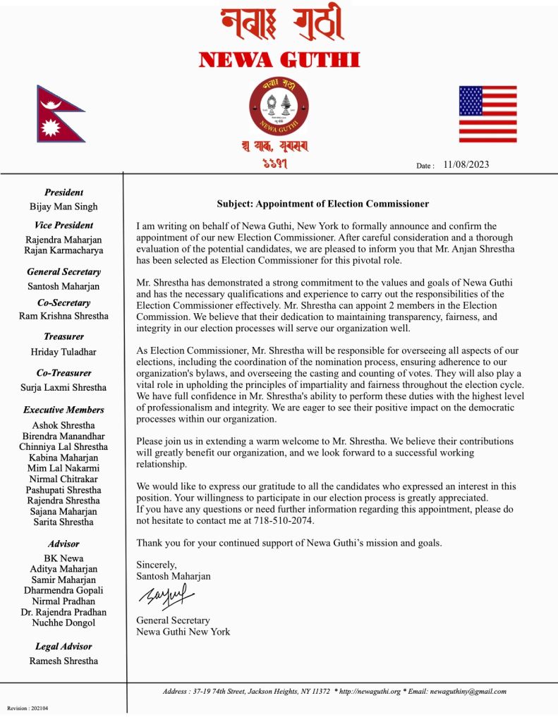 I am writing on behalf of Newa Guthi, New York to formally announce and confirm the appointment of our new Election Commissioner. After careful consideration and a thorough evaluation of the potential candidates, we are pleased to inform you that Mr. Anjan Shrestha has been selected as Election Commissioner for this pivotal role.