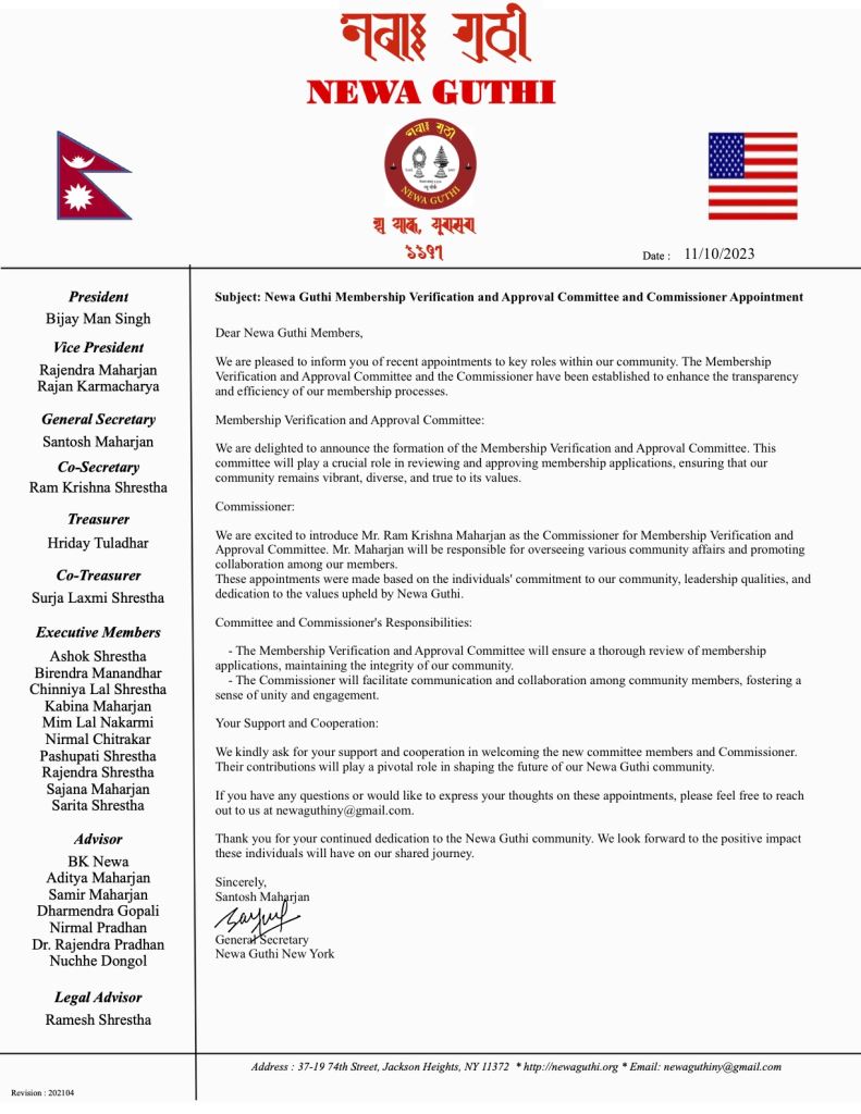 We kindly ask for your support and cooperation in welcoming the new committee members and Commissioner. Their contributions will play a pivotal role in shaping the future of our Newa Guthi community.